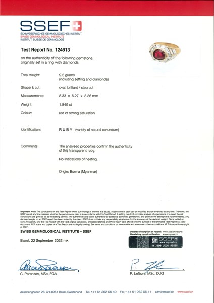 Appended gemmological report SSEF n. 124613 22/09/2022, Basilea