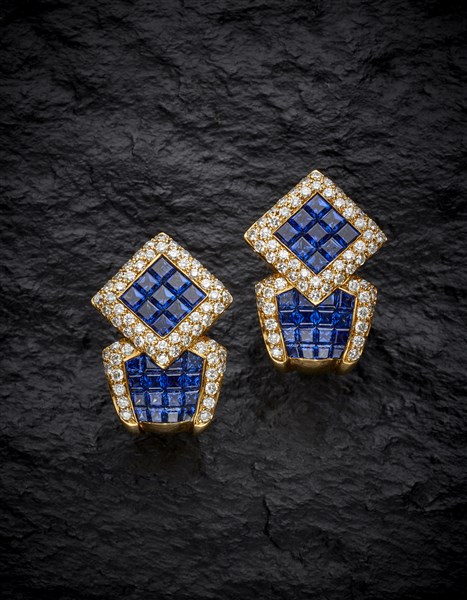 Orecchini in oro giallo a lobo con clip, diamanti e zaffiri, g 15,24 circa, lungh. cm 2,50 circa. Firmati e marcati Van Cleef & Arpels, marchi francesi di saggio, 750. In scatola originale