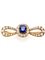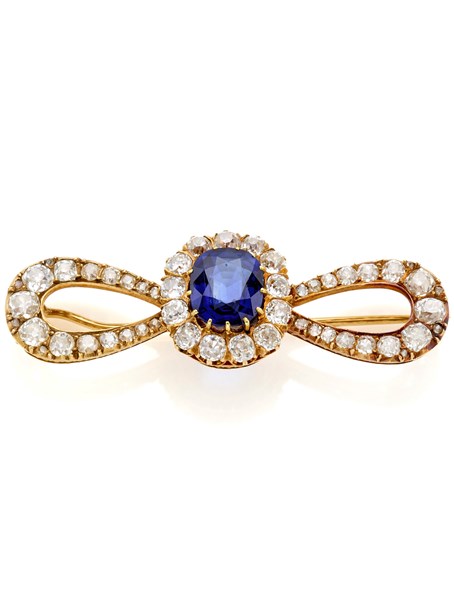 Spilla a fiocco in oro giallo e diamanti old mine, al centro uno zaffiro a cusc