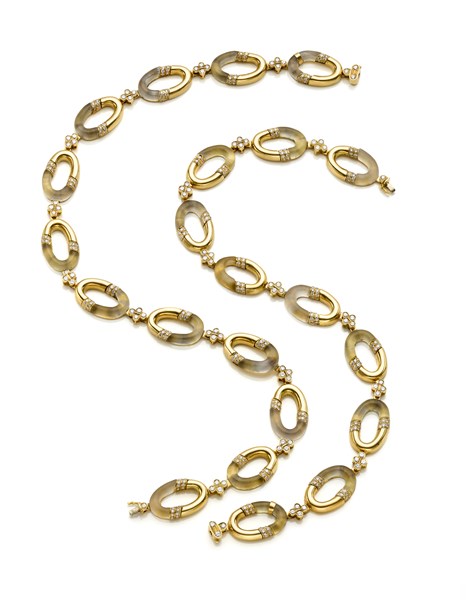 Satin hyaline quartz, diamond and yellow gold long chain divisible into two necklaces of cm 48 and cm 40 circa, g 222.61 circa, length cm 88.00 circa. Marked 10 MI.