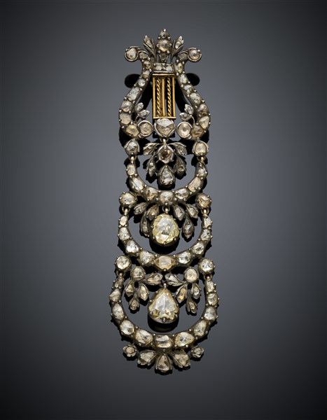 Pendente in oro rosso 333/1000, argento e diamanti, g 12,80 circa, lungh. cm 8,00 circa.