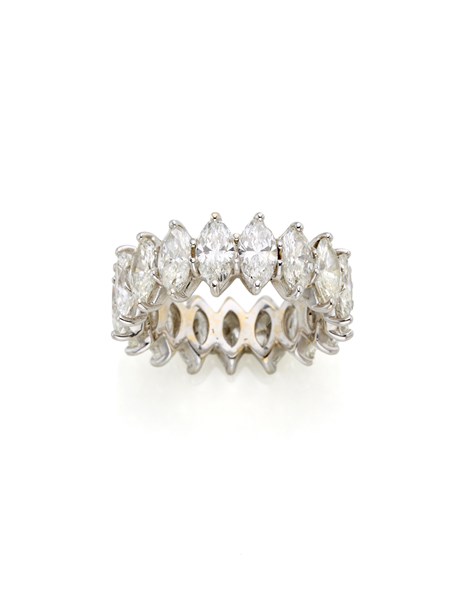 Anello eternity in oro bianco e diamanti a navette per complessivi ct. 5,10 cir