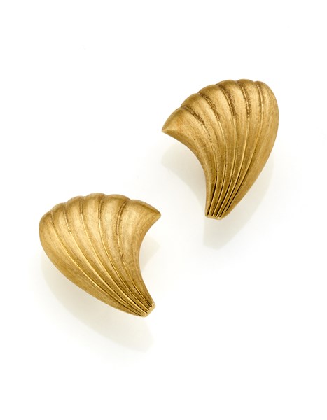 Orecchini a lobo con clip in oro giallo cesellato a guisa di conchiglie, g 5,33 circa, lungh. cm 2,20 circa. Firmato e marcato Federico Buccellati, 207 VA.