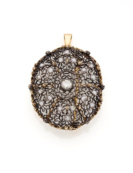 Oval yellow gold and silver openwork pendant/brooch with rose cut diamonds and central round ct. 0.45 circa diamond, g 12.39 circa, length cm 5.20 circa. Marked on the bail 562 MI.