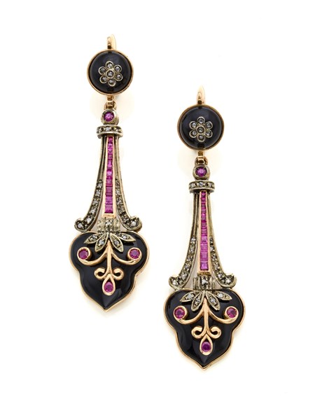 Orecchini pendenti in oro giallo e rosso 585/1000 con onice, diamanti a mezza rosetta e rubini calibré, g 22,82 circa, lungh. cm 6,60 circa. Marcati 537 NA.