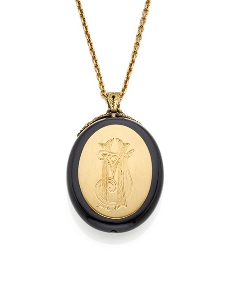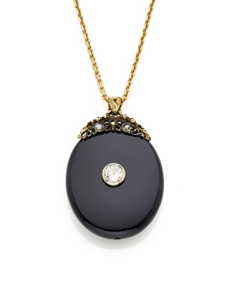 Lunga catenina in oro giallo con pendente porta foto in onice con oro e argento cesellato di cm 4,4 circa rifinito in diamanti a mezza rosetta, al centro diamante tondo di ct. 0,50 circa, iniziali sul retro, g 25,39 circa, lungh. cm 83 circa.