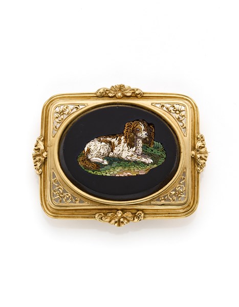 Broche in oro giallo traforato con micromosaico su onice, g 13,69 circa, lungh. cm 4,60 circa.