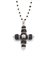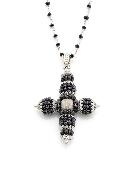 Catenina in oro bianco in parte cesellato con pendente a croce di cm 5 circa tutto rifinito con onice a briolette, g 14,21 circa, lungh. cm 51 circa. Catenina marcata 1700 AR, pendente marcato 1763 VI.