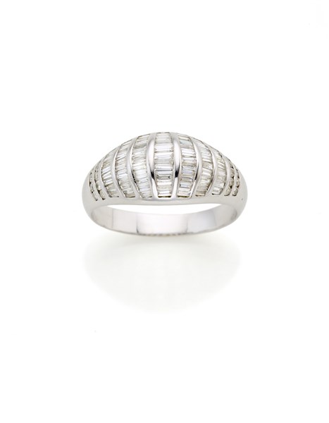 Anello in platino con diamanti a baguette e rotondi per complessivi ct. 1,80 circa, g 4,67 circa misura 19/59.