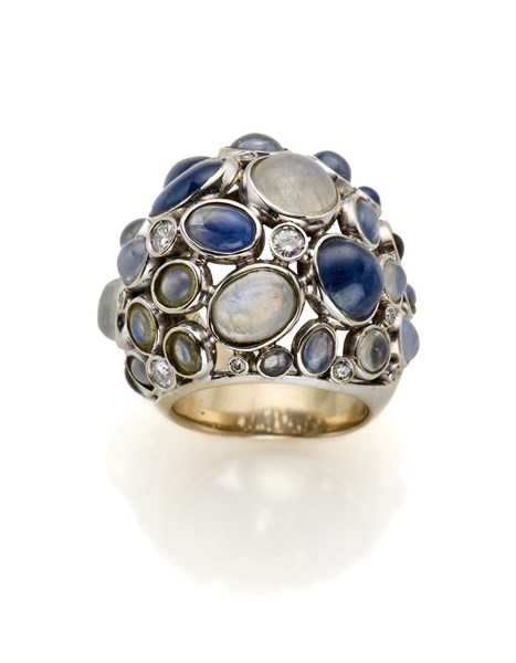 Anello a cupola in oro bianco con pietra di luna e zaffiri cabochon per complessivi ct. 8,30 circa, rifinito in diamanti, g 21,80 circa misura 13/53.