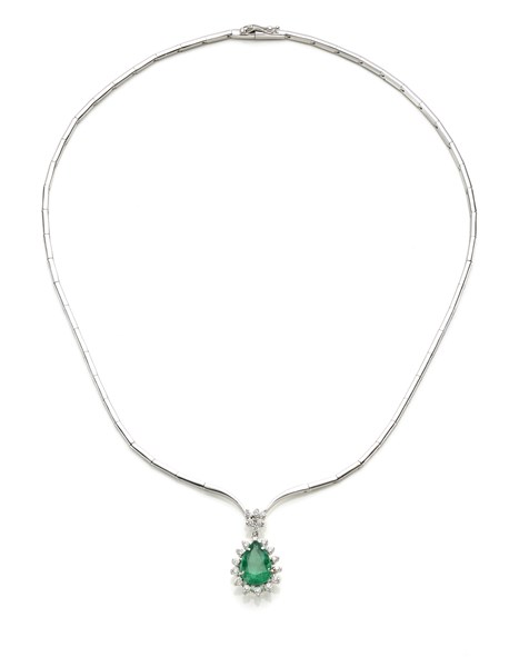 Collier articolato in oro bianco con al centro uno smeraldo a goccia di ct. 3,60 circa rifinito con diamanti, g 17,70 circa.