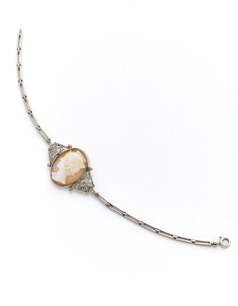 Bracciale modulare in platino con cammeo e diamanti, g 11,80 circa, lungh. cm 17,00 circa. Marchi francesi di saggio e dell'orefice.