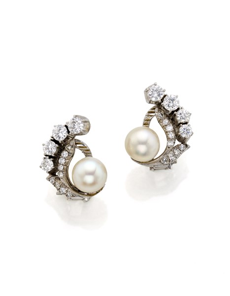 Orecchini a lobo in oro bianco con perle e diamanti rotondi per complessivi ct.
