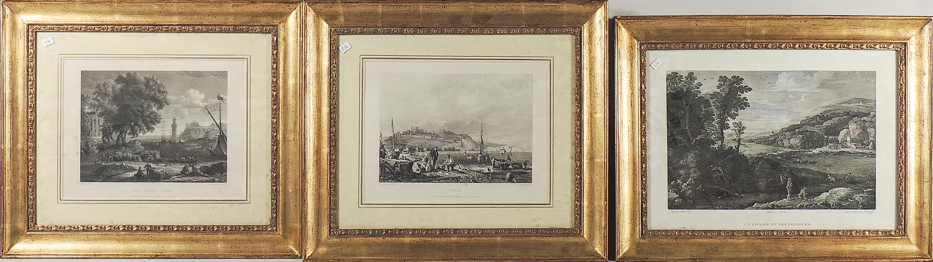TRE LITOGRAFIE INGLESI D'EPOCA raffiguranti Paesaggi marini con pescatori e Paesaggio fluviale, in cornice cm 18x25 e cm 23x35
