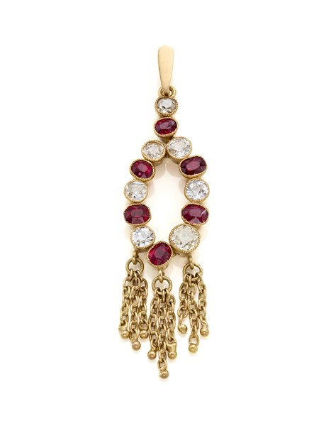 Pendente in oro giallo con diamanti old mine per complessivi ct. 1,90 circa e spinelli rossi, g 7,91 circa, lungh. cm 6,30 circa.