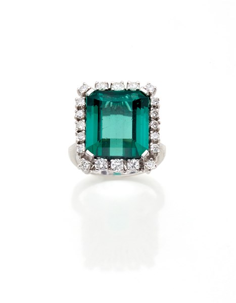 Anello in oro bianco con tormalina verde ottagonale di ct. 9,80 circa e diamanti per complessivi ct. 0,60 circa, g 10,82 circa misura 14,5/54,5.
