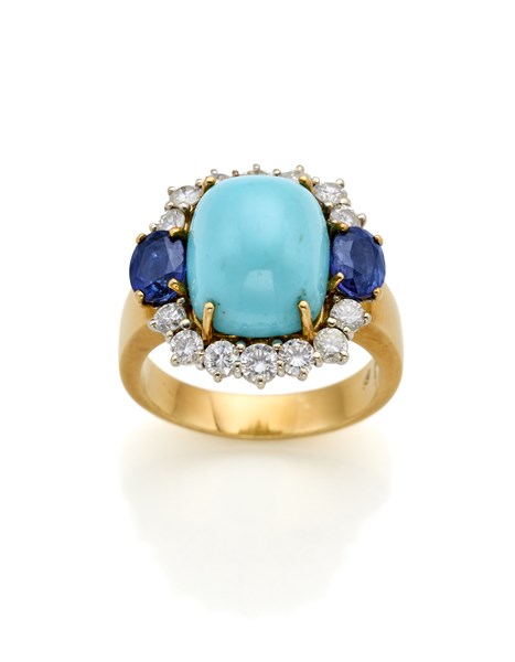 Anello in oro giallo e bianco con diamanti rotondi per complessivi ct. 0,60 circa, zaffiri ovali e al centro un turchese cabochon, g 12,78 circa misura 19/59. Marcato 274 NA.