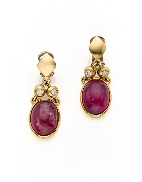 Lotto 658 | Orecchini pendenti in oro giallo a tenere una tormalina rosa cabochon e rifinit