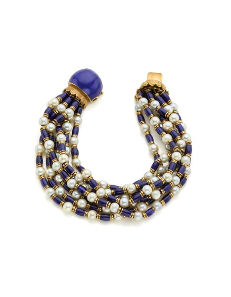 Lotto 659 | Bracciale a sette fili in oro giallo, perle e barilotti rifiniti in smalto blu,