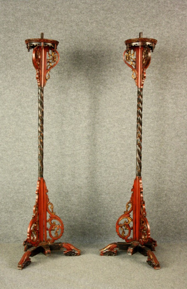 Coppia di torcere in legno intagliato, laccato e dorato. Cina. XIX secolo. Difetti. Mis. Lung. cm. 50 Alt. cm. 160 Prof. cm. 50 ca.