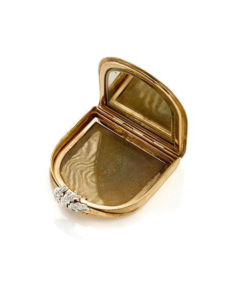 Yellow chiseled gold powder box with white gold diamond clasp, mirror inside, gross g 107.93 circa, length cm 6.20 circa.