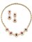 Round flat diamond, cabochon red spinel and one ruby bi-coloured gold floral shaped jewelry set comprising a cm 43.5 circa necklace and cm 4.5 circa pendant earrings, in all g 65.89 circa. (losses)