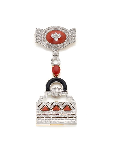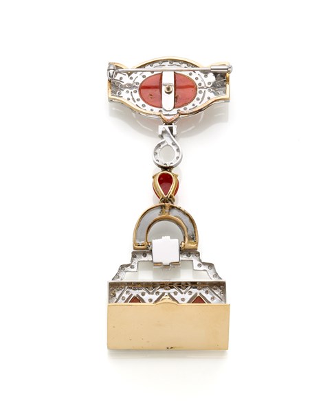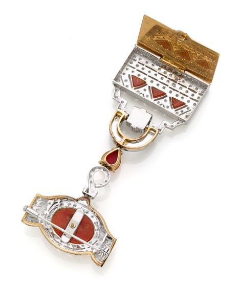 Lotto 684 | Spilla in oro bianco e giallo con corallo arancione, diamanti e onice, g 35,94