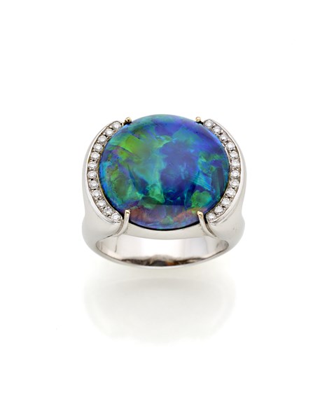 Anello in oro bianco con opale rotondo di mm 16,6 circa e rifinito con piccoli diamanti, g 15,90 circa misura 12/52.