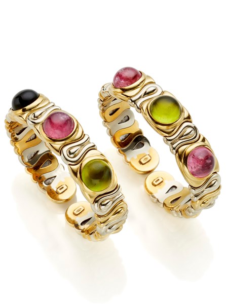 Two cabochon tourmaline bi-coloured gold bangle bracelets, in all g 167.08 circa, diam. cm 5.50 circa.