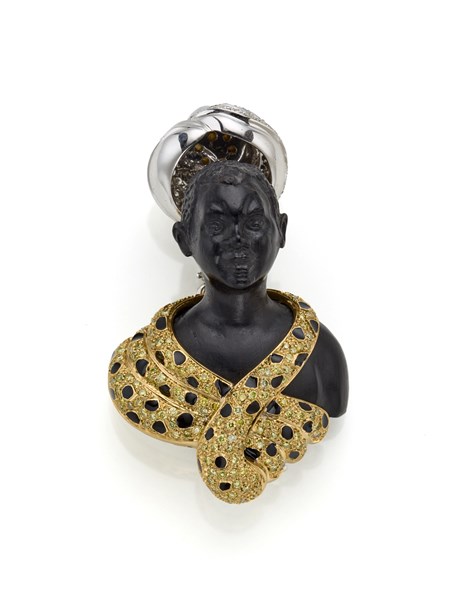 Broche a moretto in oro giallo e bianco, diamanti e perla, il volto in legno scolpito, rifinita in smalto, g 40,57 circa, lungh. cm 6,60 circa.