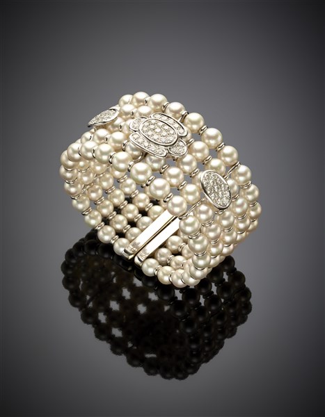 Bracciale a cinque fili di perle coltivate con distanziatori e chiusura in oro bianco e inserti con diamanti a pavé per complessivi ct. 4,50 circa, g 107,46 circa, diam. cm 6,00 circa.