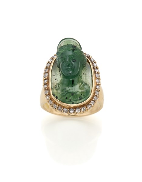Anello in oro giallo con cammeo in nefrite e diamanti a mezza rosetta, g 7,50 c