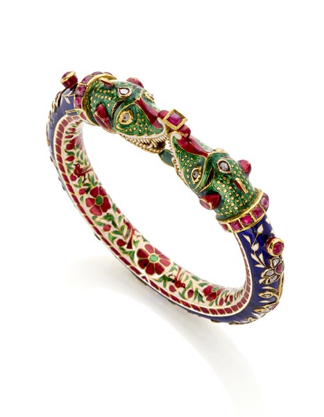 Bracciale rigido in oro giallo 916/1000 con teste di drago, rifinito con rubini cabochon, diamanti flat irregolari e smalti di vari colori, g 92,61 circa, diam. cm 5,80 circa. (difetti)
