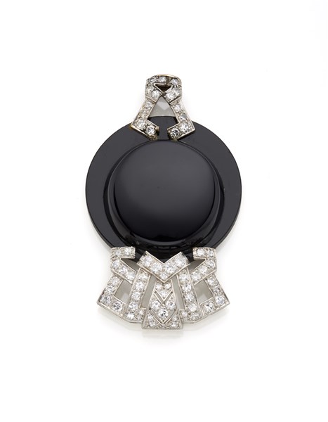 Pendente a guisa di cappello in onice e diamanti per complessivi ct. 1,90 circa, g 24,96 circa, lungh. cm 6,20 circa.