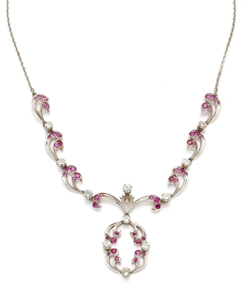 Catenina in oro bianco con centrale a volute rifinito in diamanti per complessivi ct. 3,25 circa e rubini, g 20,28 circa, lungh. cm 45,50 circa. Catenina marcata Uno.A.Erre, 1 AR.