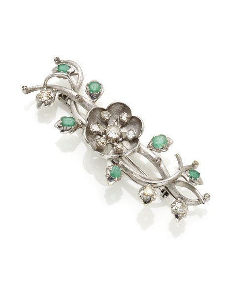 Spilla floreale in oro bianco cesellato rifinita con diamanti old mine per complessivi ct. 2,00 circa e smeraldi per complessivi ct. 2,00 circa, g 25,48 circa, lungh. cm 5,30 circa.