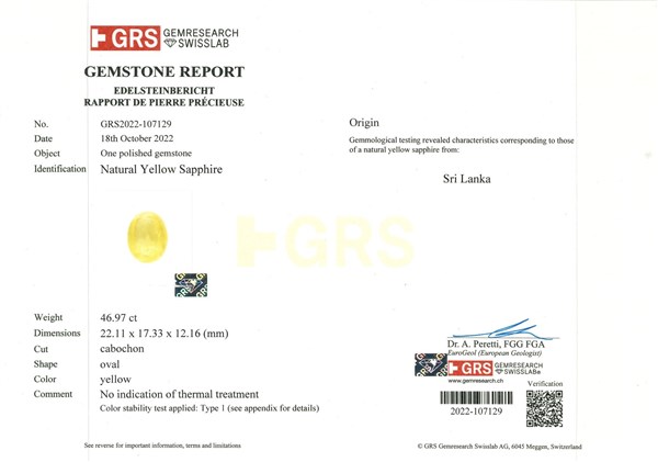 Appended gemmological report GRS n. GRS2022-107129 18/10/2022, Svizzera