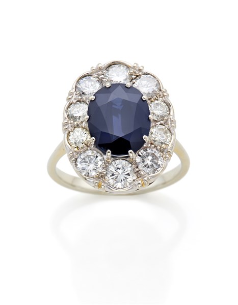 Anello in oro bianco con zaffiro ovale di ct. 3,60 circa contornato da diamanti per complessivi ct. 1,85 circa, g 6,64 circa misura 18/58.