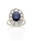 Anello in oro bianco con zaffiro ovale di ct. 3,60 circa contornato da diamanti