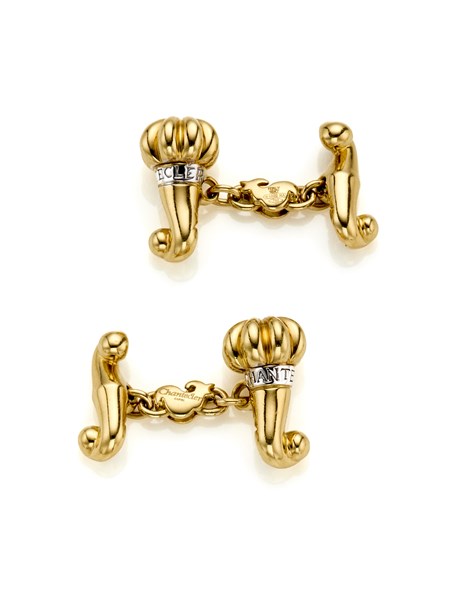 Bi-coloured gold cornucopia shaped cufflinks, g 10.95 circa, length cm 1.70 circa. Signed Chantecler Capri, 1059 NA, Italy.