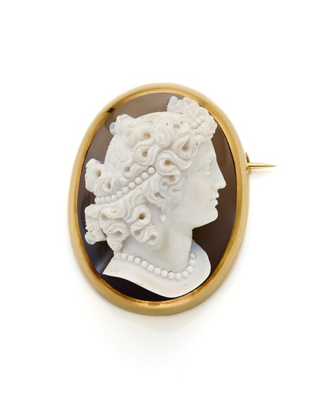 Spilla con cammeo in pietra dura montata in oro giallo, g 53,74 circa, lungh. cm 4,90 circa. Marchi francesi di saggio e dell'orefice.