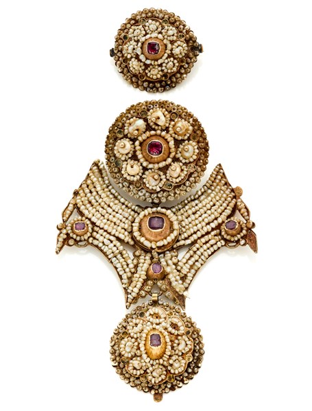 Spilla e orecchino modificato a pendente di cm 9,6 circa in oro giallo con microperle, piccoli rubini e gemme varie, complessivi g 23,95 circa. (difetti e mancanze)