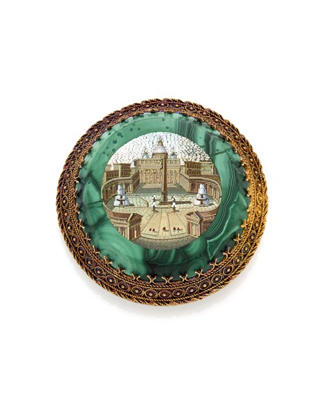 Broche in oro giallo con micromosaico su malachite, g 18,59 circa, diam. cm 4,1