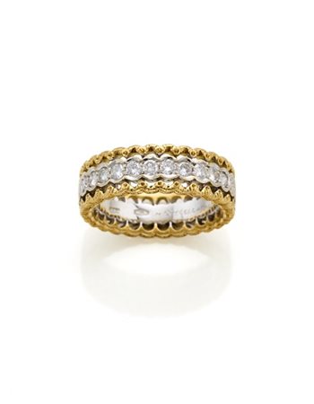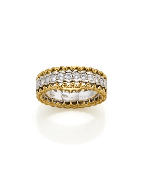 Anello a fascia in oro bianco e giallo cesellato e rifinito in diamanti, g 6,97 circa misura 14/54. Firmato e marcato M.Buccellati, 15 MI.
