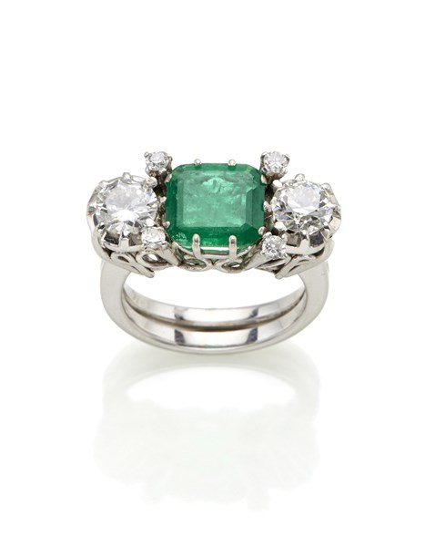 Lotto 807 | Anello in oro bianco con smeraldo ottagonale di ct. 1,90 circa, ai lati due dia