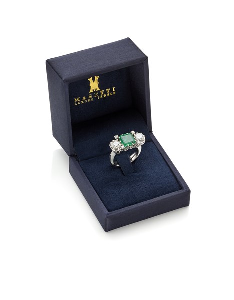 Anello in oro bianco con smeraldo ottagonale di ct. 1,90 circa, ai lati due diamanti di ct. 0,90 circa e rifinito con diamanti più piccoli per complessivi ct. 2,05 circa g 10,41 circa misura 15/55. In scatola Masetti Luxury Jewels