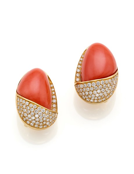 Orange coral and diamond yellow gold acorn shaped earclips, diamonds in all ct. 2.40 circa, g 26.41 circa, length cm 2.80 circa. Signed and marked Repossi, 3483 AL. In original case