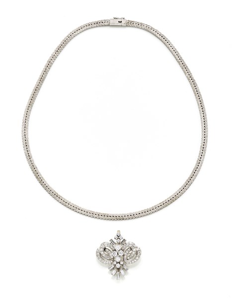 Collier in oro bianco cesellato con spilla/pendente in diamanti rotondi e baguette per complessivi ct. 1,75 circa, con vecchia montatura a clip, complessivi g 35,56 circa. Marcato MI 49.