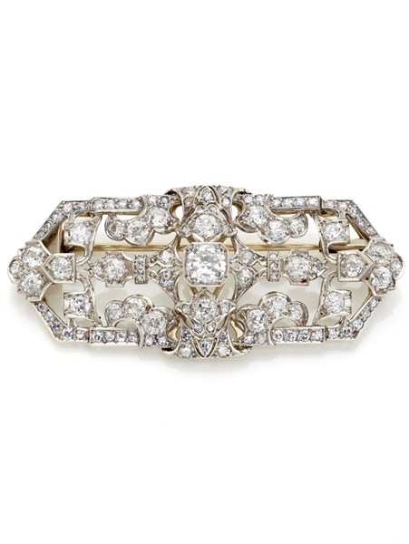 Broche traforata in oro bianco e diamanti per complessivi ct. 3,05 circa, al centro diamante di ct. 0,65 circa, g 16,33 circa, lungh. cm 5,60 circa. In scatola Furio Saracco Torino