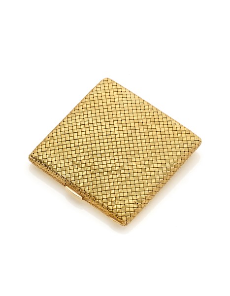Portacipria quadrato in oro giallo lavorato a cestino, specchio allinterno, lordi g 141,14 circa, lungh. cm 7,10 circa.